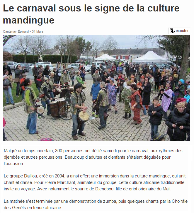 Suite au Carnaval de Cantenay-Épinard le 28 mars 2015, le Collectif Dalilou a eu droit à un article dans le journal Ouest France : Le carnaval sous le signe de la culture mandingue.
