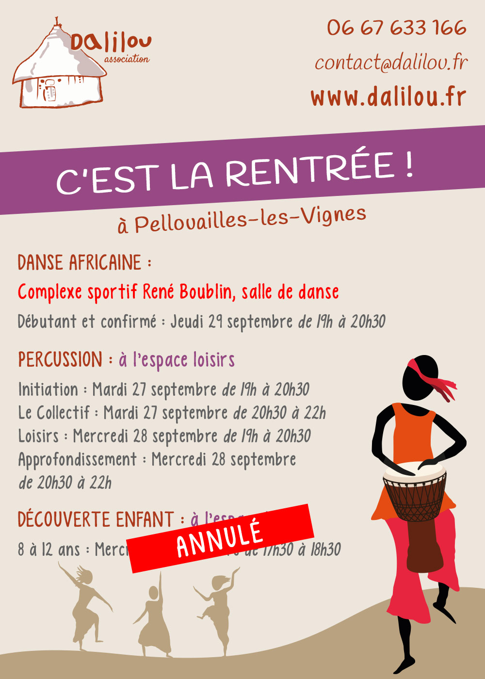 L’heure de la rentrée a sonné pour Dalilou, les ateliers démarrent la semaine prochaine ! Tous nos ateliers ont lieu à Pellouailles-les-Vignes, commune de Verrières-en-Anjou. N’hésitez pas à venir rencontrer nos animateurs et profitez d’un premier cours gratuit et sans engagement !